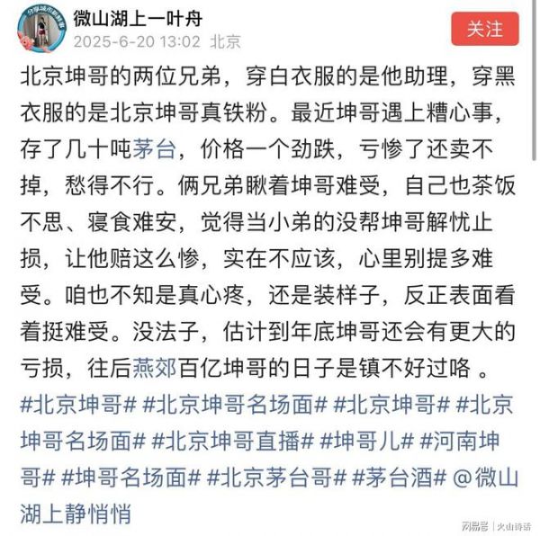 这究竟是咋回事?另有北京网友同日发帖称,北京坤哥的两位兄弟,穿白衣服的是他助理,穿黑衣服的是北京坤哥真铁粉。最近坤哥遇上糟心事,存了几十吨茅台,价格一个劲跌,亏惨了还卖不掉,愁得不行。