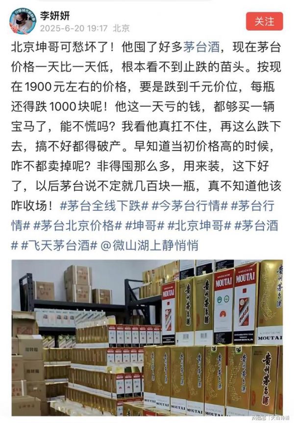 6月20日有北京网友发帖,北京坤哥可愁坏了!他囤了好多茅台酒,现在茅台价格一天比一天低,根本看不到止跌的苗头。按现在1900元左右的价格,要是跌到千元价位,每瓶还得跌1000块呢!