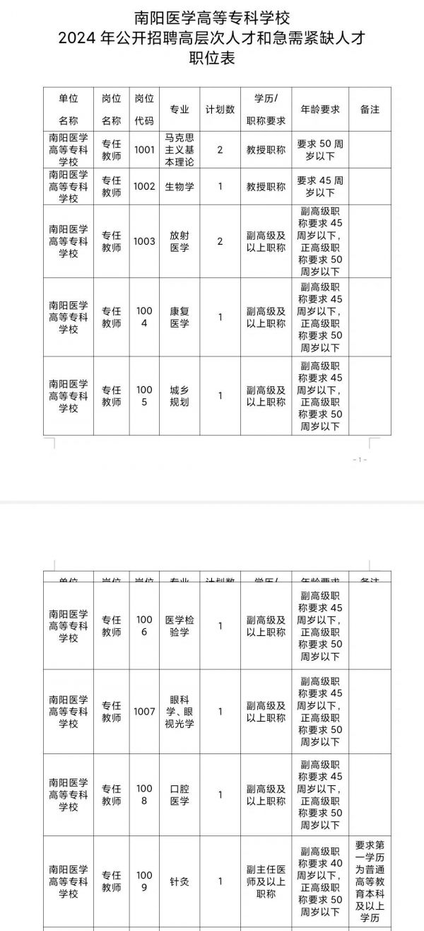 南阳医专招聘!高层次人才速来 应届医学...全文