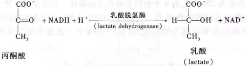 动物包括人在缺氧情况下,糖酵解过程产生的丙酮酸在乳酸脱氢酶存在下作为还原型NADH的受氢体,从而产生乳酸,并再生NAD+继续参与氧化而产生ATP。