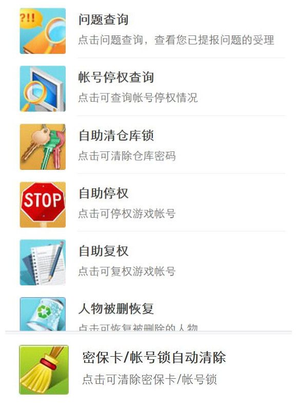 自助服务里面包含了问题查询(可以查看自己提报的问题的受理情况)、帐号停权查询、自助清仓库锁、自助停权、自助复权、人物被删恢复、密保卡/账号锁自动清除;