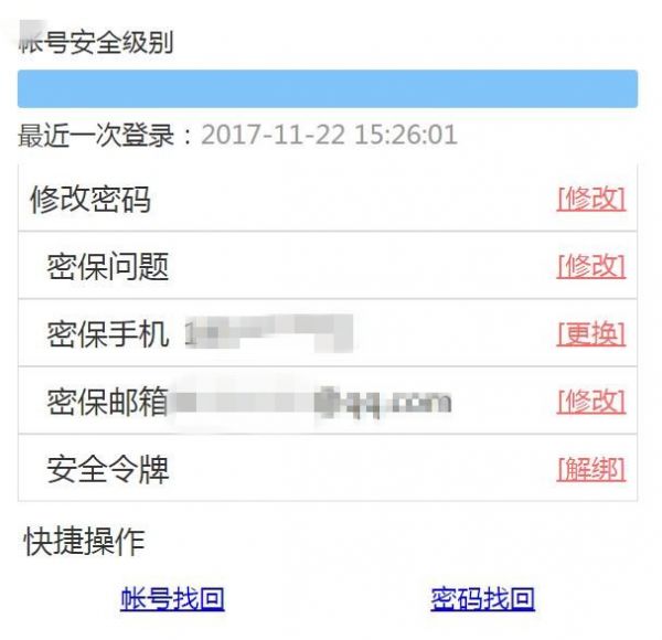 安全中心里面包含了密码、密保问题、密保手机、密保邮箱、安全令牌的修改和更换。