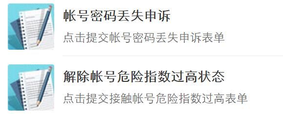 帐号问题里面包含了帐号密码丢失申诉、解除帐号危险指数过高状态;