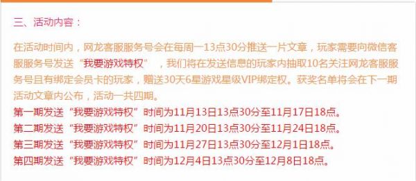 为了响应美女主播活动,从11月13号-12月8号这个时间段,只要关注网龙客服服务号且有绑定会员卡的玩家,给这个公众号发送“我要游戏特权”就有机会获得免费6*VIP特权一个月!