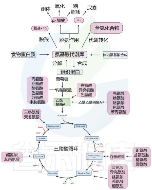 通常,我们体内的氨基酸以游离氨基酸总量计算,包括两部分,一是内源氨基酸,即体内组织蛋白降解产生或自身合成的非必需氨基酸;二是外源氨基酸,即食物蛋白质经消化吸收而来。两者共同分布于身体各处,参与代谢,总称为氨基酸代谢库。