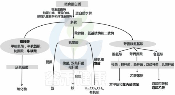 其中一些细菌可以直接代谢氨基酸,并具有分泌各种蛋白酶和肽酶的能力。发酵过程中,复杂蛋白质首先被各种细菌肽酶、蛋白酶和内肽酶切割,释放出游离氨基酸和短肽。然后对氨基酸和短肽进行发酵。产生支链脂肪酸(2-甲基丁酸酯、异丁酸酯、异戊酸酯)、有机酸、气体(H2和CO2)以及微量酚、胺、吲哚和氨。