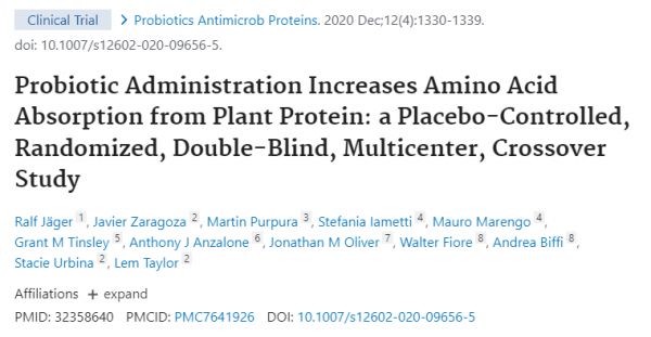 Jäger R, Zaragoza J, Purpura M, Iametti S, Marengo M, Tinsley GM, Anzalone AJ, Oliver JM, Fiore W, Biffi A, Urbina S, Taylor L. Probiotic Administration Increases Amino Acid Absorption from Plant Protein: a Placebo-Controlled, Randomized, Double-Blind, Multicenter, Crossover Study. Probiotics Antimicrob Proteins. 2020 Dec;12(4):1330-1339.