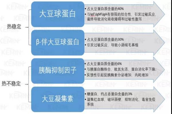 热不稳定的胰蛋白酶抑制剂和大豆凝集素可以通过加热解决,而热稳定的大豆球蛋白和伴球蛋白需要通过原料处理或者日粮添加蛋白酶来解决。