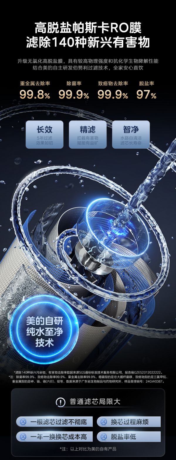 同时搭载美的自主研发伯努利过滤技术,其亚硝酸盐去除率99.3%、余氯去除率99.9%、重金属去除率99.9%、细菌去除率99.9%。能通过涵盖升级高脱盐帕斯卡RO膜、长白山矿石过滤层在内的六层精滤隔绝氟化物、微塑料等140种有害物质,出水可让家人放心直饮。水路还具备智能自清洗功能,确保水路洁净的同时,能有效延长滤芯使用寿命,使其能做到5年长效使用效果不衰减,也无需频繁更换。