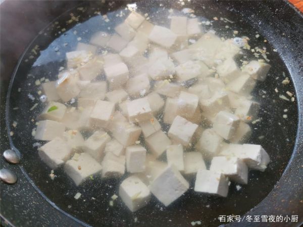 5.锅加水烧开,下入姜末和豆腐,大火烧开,转中小火煮5-6分钟。