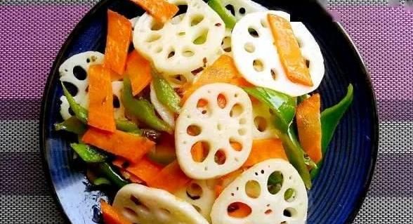 藕片炒青笋胡萝卜,色彩鲜艳,寓意着满园春色。莲藕富含维生素C和膳食纤维,青笋和胡萝卜也含有丰富的维生素和矿物质。将三种食材去皮切片焯水后,锅中倒油,爆香葱蒜,放入食材,加水淀粉翻炒,用盐和松茸鲜调味,清爽可口又富含营养。