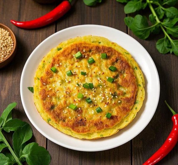 03.翻面煎至金黄:待煎饼底部煎至凝固且微微金黄时,翻面继续煎另一面,直至两面均呈金黄色,即可出锅,切成适口大小食用。