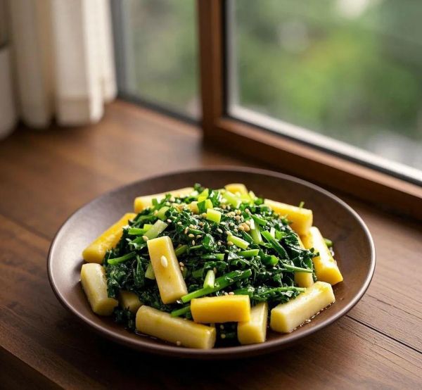 03.加入荠菜:待年糕炒熟后,加入荠菜段,快速翻炒均匀。