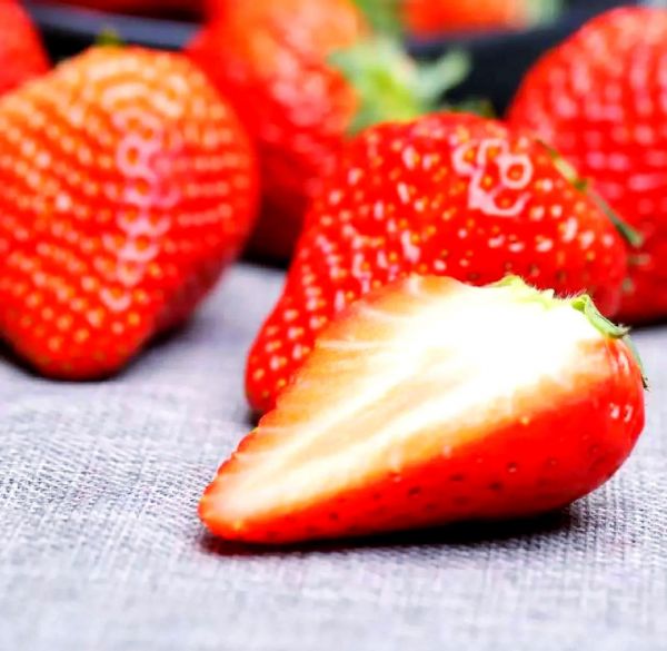 细长白心的为章姬草莓,口感较甜不酸;外形圆锥果心淡红的为红颜草莓,酸酸甜甜。