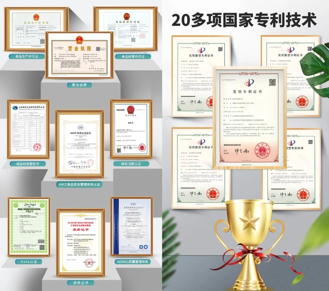 海龙元生物荣获20余项知识产权专利,通过ISO9001、ISO22000、IKOS和HACCP管理体系认证,并获得了“国家高新技术企业”、“创新型企业”、“专精特新企业”、“中国轻工业联合会科技进步一等奖”、“山东省科技创新一等奖”、“全国商业科技进步奖一等奖”、“2020年山东省新旧动能转换重大项目”、“产学研创新合作成果奖”等荣誉,受到业内及客户的广泛认可和好评。