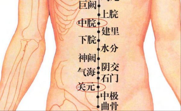 在上要摩至中脘穴,在下要摩至关元穴,这是本节操作的关键之处。因为腹部可分天地,以神阙为界,脐以上为地,脐以下为天。