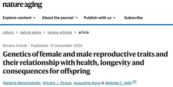 生殖遗传学是复杂的,遗传的影响与不断变化的社会文化因素交织在一起。牛津大学的研究人员发表了一篇题为:Genetics of female and male reproductive traits and their relationship with health, longevity and consequences for offspring 的综述文章【2】,回顾了女性和男性生殖性状的全基因组关联研究,并讨论了生殖遗传学与健康、衰老和长寿的关系,对这一快速发展的领域进行了总结。