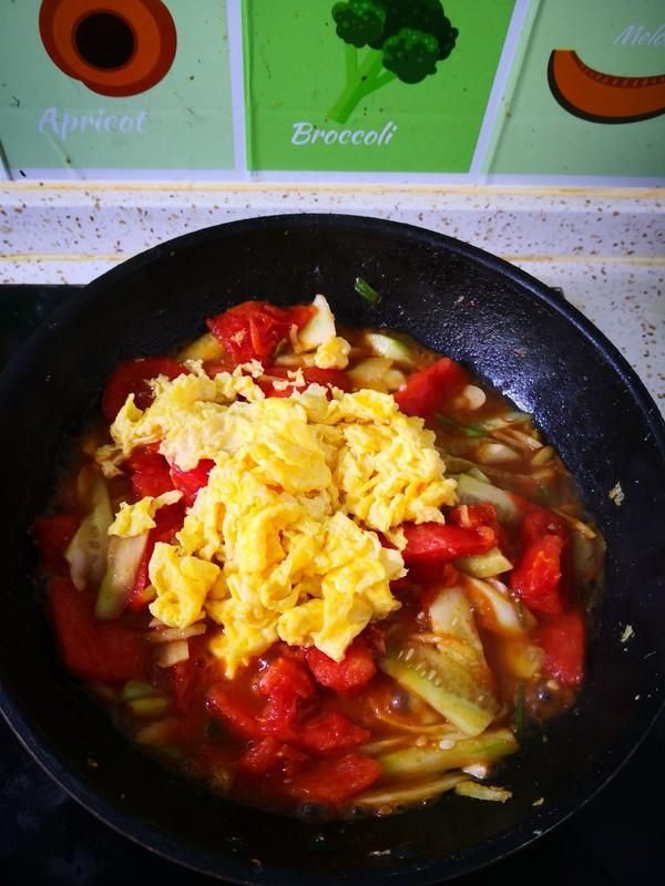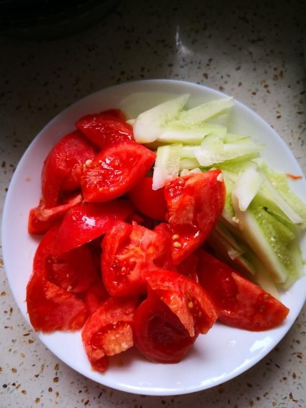 西红柿 2个、秋黄瓜 一根、鸡蛋 2个、葱姜蒜 适量、料酒 少许、十三香 少许、酱油 少许、精盐 少许、玉米油 适量