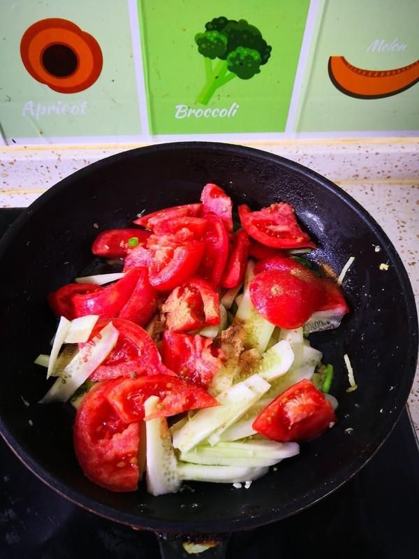 5.热锅凉油放入葱姜蒜爆香,料酒十三香,加入黄瓜片西红柿翻炒。