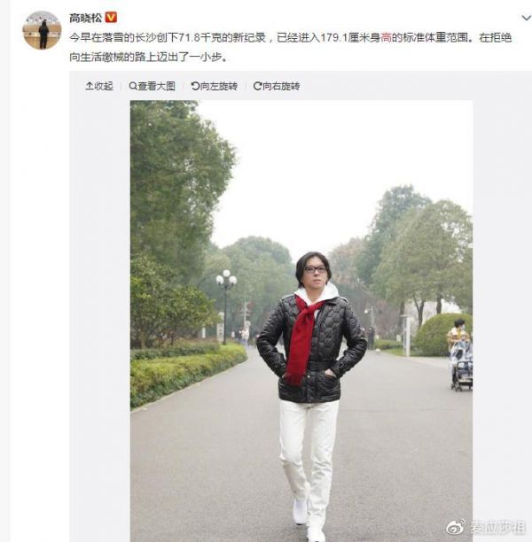 近日,高晓松瘦了的消息又上热搜了!高晓松在社交平台发文:“今早在落雪的长沙创下71.8千克的新纪录,已经进入179.1厘米身高标准体重范围。在拒绝向生活缴械的路上迈出了一小步。 ”并配了几张日常散步的照片,从照片上可以看出,1米79的高晓松身材高挑,比以前确实精神了很多。
