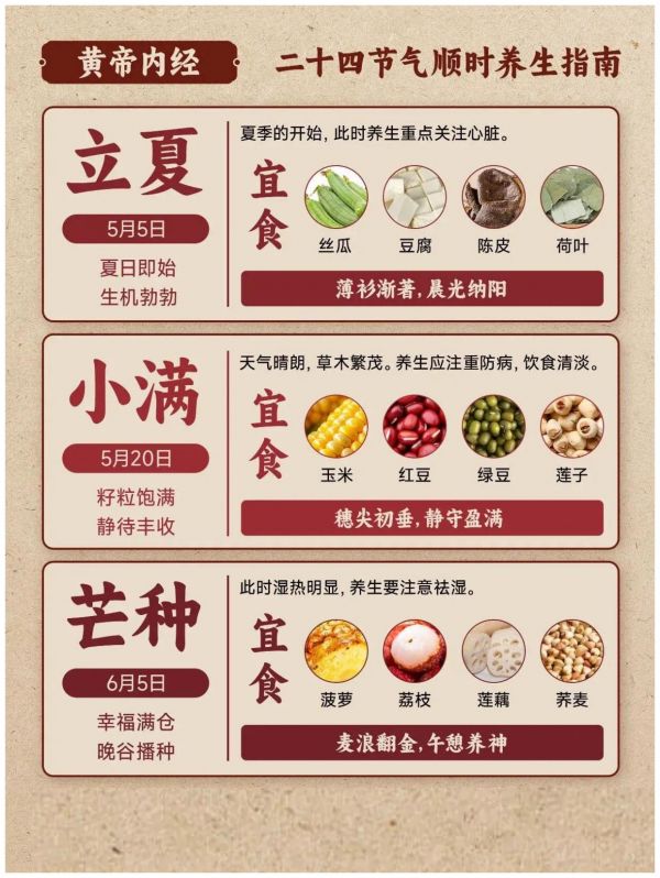 ,等到立夏,气温升高,新陈代谢加快。宜晚睡早起,适当午睡。运动要适度,避免大汗淋漓,损伤阳气。饮食以清淡为主,多吃蔬菜水果,如西瓜、黄瓜等,可补充水分和营养。