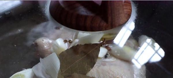 第三步:大葱斜着切段,生姜正常切片,然后我们再取一些花椒、八角、桂皮和香叶放入碗中备用。鸡肉冷水下锅,再放入我们准备好的大料给它倒进去,这些大料不仅可以去腥,同时更能提升鸡肉的口感与香气,之后大火煮开转小火煮八分钟。