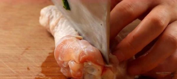 第二步:将鸡腿用清水冲洗干净准备脱骨。首先我们要分辨出鸡腿的正反面,正面为肉厚的一面,反之背面则是肉相对较薄的一面。在分辨清楚鸡腿正反后,我们用菜刀沿鸡腿背面竖着慢慢切到底,再将骨肉黏连处沿刀口撕开这样我们就能得到一整块光滑完整的鸡腿肉了,将全部鸡肉处理完毕后放在一旁备用。