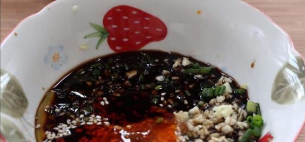 第五步:小葱、大蒜切末放入碗中,加入一勺蚝油、一勺陈醋、一勺香油、一小勺盐、两勺生抽、两克白糖以及两大勺辣椒油搅拌均匀。按照这个调制出的酱汁酸、甜、辣俱全,劲道十足、香气浓郁即便不配任何肉食,单单配馒头都能吃上好几个。