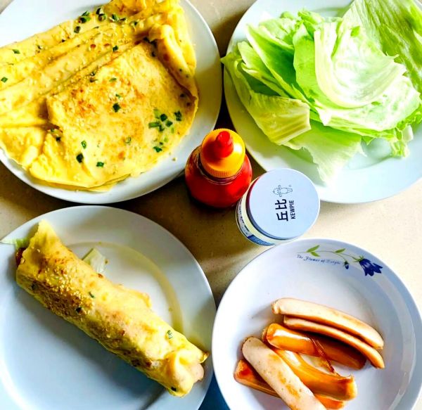最后,将煎饼卷上生菜、火腿肠,挤上沙拉酱和番茄酱,享受你的美味早餐吧!