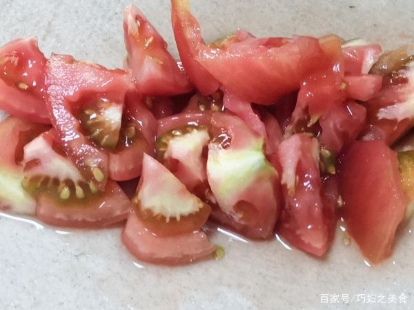 1、锅中烧水,水开放入整个的番茄,烫一下捞出,把番茄剥皮,然后切成滚刀块,放入盘中备用。