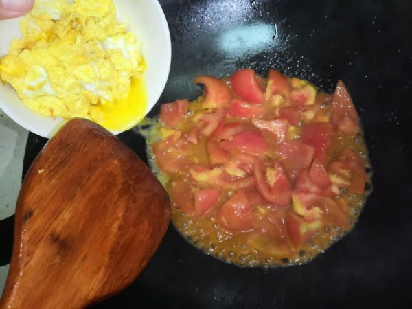 4、锅中放油,将番茄放入跌锅翻炒,放入炒好的鸡蛋,加入淀粉勾芡。