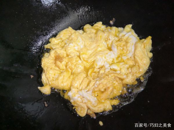 2、锅中放入少许植物油,油温五成热放鸡蛋液迅速翻炒,装盘。