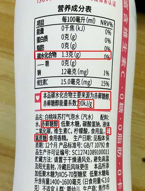 无糖气泡水真的不含糖吗?尽管如此,相较于含糖饮料,李女士觉得气泡水的糖分含量更低,偶尔饮用也不会产生“负罪感”。《中国食品安全网》对超市进行走访后发现,市面上推出的气泡水品牌层出不穷,在商超的展示柜上均占据一席之地。以朝阳区清华东路某小型商店为例,气泡饮料甚至占据了整个饮料冷藏展示柜,这些产品的包装上都鲜明地标注着“0糖、0卡”等宣传语。同样,在丰台区槐房万达广场的某超市内,名仁白桃味苏打气泡水和悦己未来青提海盐味气泡水的营养成分表中也都显示,每100ml产品中的糖和能量等成分均为0,而配料表中则以水和赤藓糖醇为首。