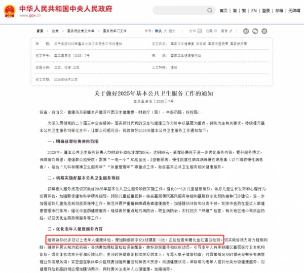 重磅!国家卫健委、中医药局、疾控局等四部门联合发布《关于做好2025年基本公共卫生服务工作的通知》,首次将糖化血红蛋白(HbA1c)检测与胸部DR共同纳入65岁以上老年人健康体检必查项目!