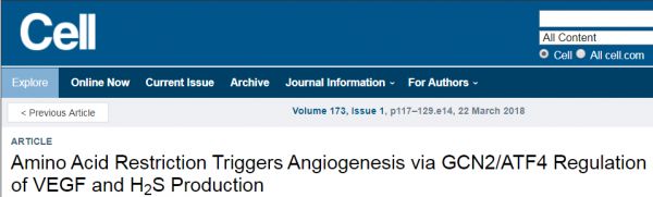 3月22日,最新发表在Cell杂志上题为“Amino Acid Restriction Triggers Angiogenesis via GCN2/ATF4 Regulation of VEGF and H2S Production”的论文中,来自哈佛大学陈曾熙公共卫生学院的科学家们又有了新的发现。研究表明,给小鼠喂以含少量Met的饮食触发了骨骼肌内新血管的形成。研究人员认为,或许是血管功能的改善使得Met限制饮食能够发挥延长寿命的作用。