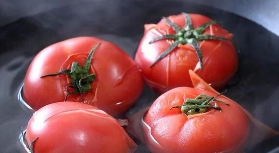 首先需要准备3~4个生番茄,先洗净番茄,然后在番茄顶端划出十字刀花,为了之后好撕掉番茄皮,然后准备一锅开水,将番茄挨个放入锅中,烫15秒左右后,再翻一个面再烫15秒,这时番茄的表皮已经开始脱落的迹象,露出番茄内部红彤彤的果肉。