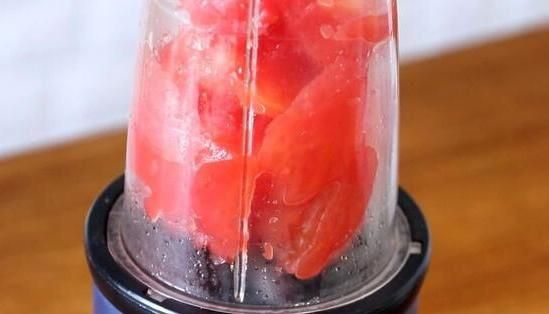 再捞出烫好的番茄,然后通过十字刀口就能轻松撕掉番茄的表皮,拔掉番茄蒂,再用刀将番茄的果肉切成小块,然后装入榨汁机中打成番茄泥备用,如果家中没有榨汁机等工具,还有一个简单的方法,可以直接将番茄小块装在碗中,用较厚的勺子将番茄压成果泥。