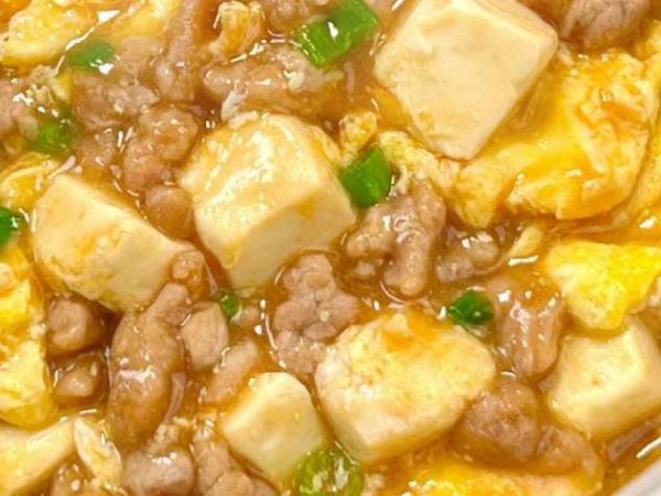 5、再次起锅烧油,油热后倒入嫩豆腐鸡蛋液煎一下,煎至稍微定型后,用锅铲炒散。再放入肉末和酱汁,搅拌均匀煮至浓稠,撒上葱花即可出锅装盘开吃。