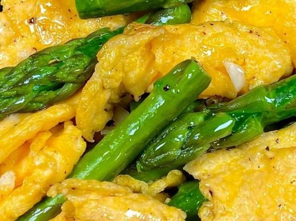 4、再次起锅烧油,油热后放入蒜末炒香,再放入芦笋翻炒煮熟,然后放入鸡蛋,加入食盐和黑胡椒碎翻炒均匀,炒至入味即可出锅装盘开吃。