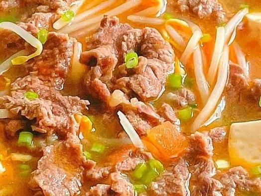 4、牛肉煮熟后放入绿豆芽和嫩豆腐煮两分钟,煮熟后加入食盐调味,撒上葱花即可出锅开吃。