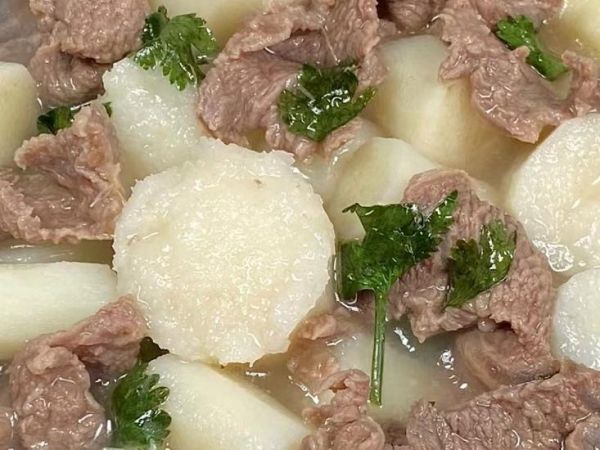 3、山药煮熟后,放入牛肉煮两三分钟煮熟,牛肉煮至变色后,加入食盐和胡椒粉调味,搅拌均匀煮至入味,撒上香菜碎即可出锅开吃。