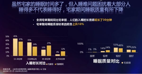 白皮书显示,全民宅家期间,人们的睡眠时长急速上升,但是睡眠质量反而下降了;宅家前90%的人集中在20-24点就寝,宅家期间凌晨后就寝的人超过50%;江西人成了“熬夜冠军”,浙江人则是“晚起状元”……