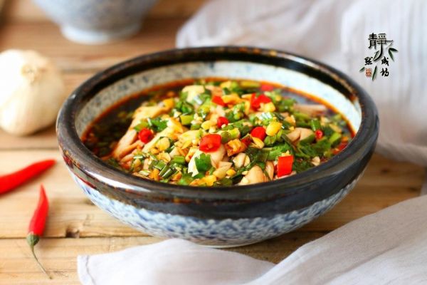 做法:鸡腿、姜片、黄酒,冷水下锅,开盖煮上约10分钟,离火盖锅盖继续焖上几分钟,然后捞出过凉,剁块儿或是手撕成条状装盘,用材料中其他的调味料调个料汁儿,浇在鸡肉上即可。肉嫩香辣,吃着极为过瘾。