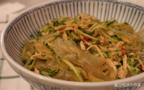 做法:凉粉切块,黄瓜丝、鸡丝叠放;淋麻酱汁,点缀薄荷叶,加冰水更清凉。解暑饱腹,味道好。