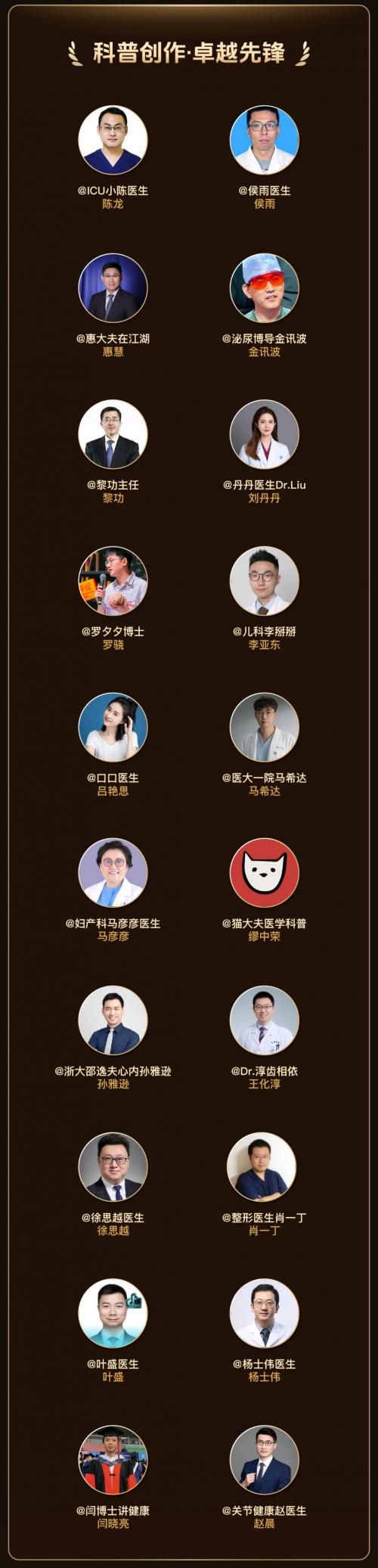 透过医疗创作者们的内容科普,大量复杂的疾病变得更加通俗易懂,诸多健康常识更加深入人心。不少创作者深受网友欢迎,粉丝数量达到了百万、千万以上。@心中有术、@薄世宁医生、@崔玉涛、@医路向前巍子、@鹤立烟雨 等账号纷纷入选“科普创作·人气先锋”名单。