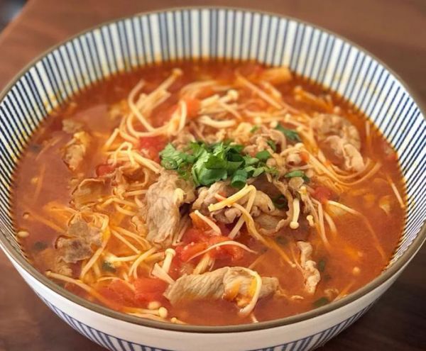 5、下入金针菇继续煮2分钟左右,加入生抽,醋,食盐调味,最后撒上香菜碎即可出锅。