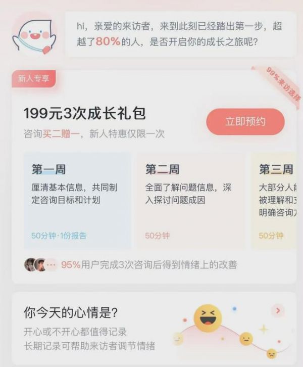 1)心理健康需求激增,但传统咨询门槛太高近年来,随着生活节奏加快和社会压力增大,越来越多的人开始关注自己的心理健康。然而,传统的心理咨询存在诸多问题:费用高昂、预约困难、地理位置限制以及“不好意思开口”的心理障碍。这些因素让许多人望而却步,甚至放弃寻求帮助。