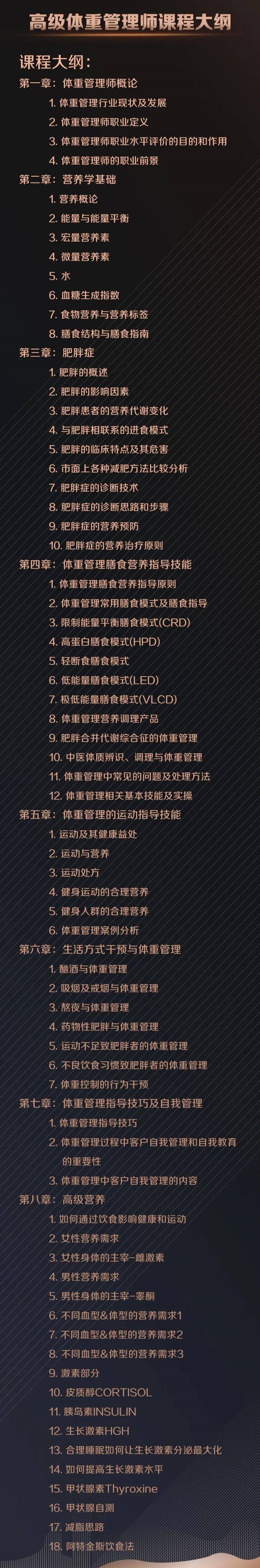 课程包含膳食营养、运动指导、生活方式、饮食规划、肥胖成因分析等多方面体重管理师的职业技能知识,同时报名学员还可领取体重管理案例与计划包,在掌握后可以以专业化角度的对客户进行相关指导,帮助客户进行体重管理,塑造健康生活。即使不想以此作为职业,体重管理师的相关知识也对自己和家人有巨大的帮助,学习之后,可以从营养学的角度科学合理地规划家庭的饮食习惯,也有利于我们家人的健康。