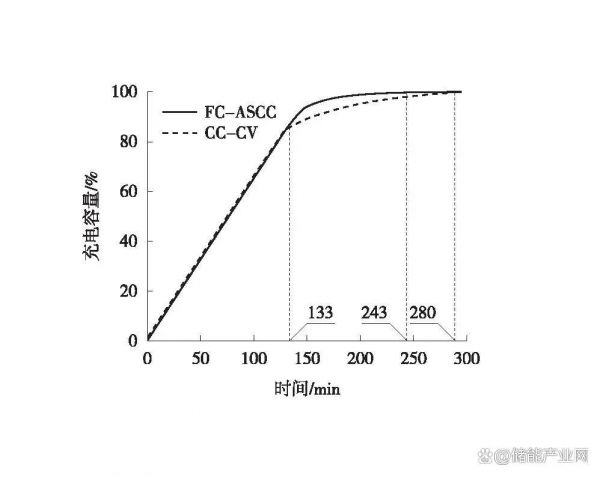 在传统CC-CV充电过程中,恒流阶段使用25%~40%的总时间,能够充入75%~80%的总容量;恒压阶段的充电效率相对很低,对CV段的改进成为优化的重点[10]。文献[10]设计了一种基于模糊控制的有源充电状态控制器(FC-ASCC),用于替代传统的恒压充电过程,如图3所示。在充电状态安全边界上,基于感知模式(SM)和充电模式(CM)建立FC-ASCC,FC-ASCC通过电流自寻优方法,为电池提供适宜的充电电流,提高充电速度。FC-ASCC优化技术和传统CC-CV方式充电数据对比如图4所示。由图4可知,相比传统CC-CV充电方法, FC-ASCC充电优化技术使充电时间缩短了23%[10]。