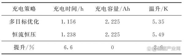 基于多目标与优化多段充电同恒流恒压充电相比,多阶段充电的第一阶段充电电流高于恒流恒压充电的恒流值,而第2~4阶段充电电流大幅度降低,低于恒流恒压充电的恒压阶段的电流值;由于多阶段充电的电流值更高,其充电电压要略高于恒流恒压充电。多目标充电策略与恒流恒压充电数据对比见表2[2]。